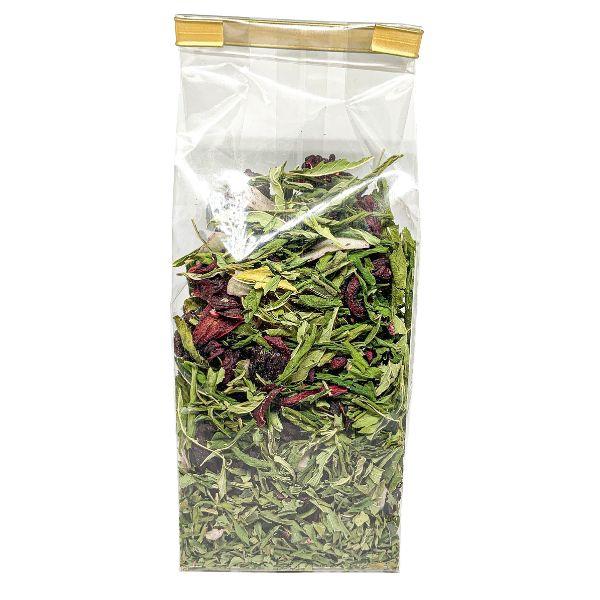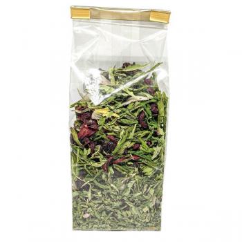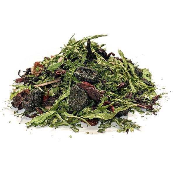 Skład mieszanki: Kwiaty hibiskusa 46,6%, liście konopi włóknistej 22%, suszone wiśnie 15,5%, płatki kokosa, suszone winogrona, jagody Goji, aromat.