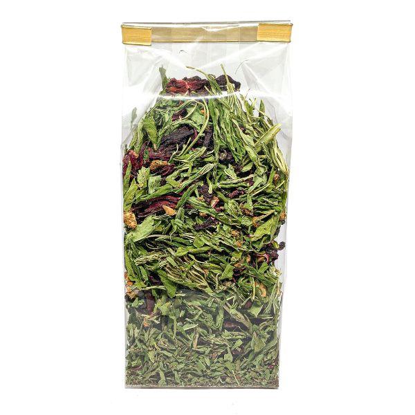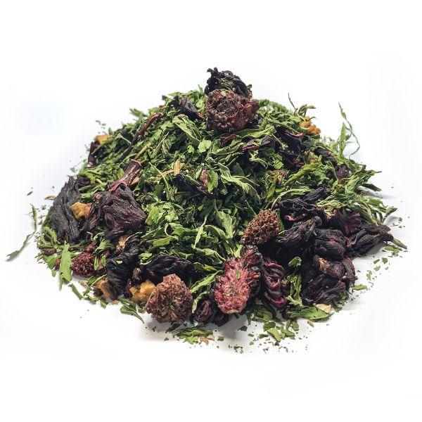 Skład mieszanki: Hibiskus 46,6%, liście konopi włóknistej 22%, jabłko 9,3%, jeżyna liofilizowana, malina, czarny bez, aromat, owoce jeżyny i poziomki.