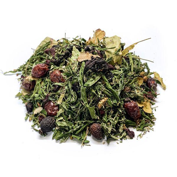 Skład mieszanki: owoc dzikiej róży (31%), hibiskus (24%), liście konopi włóknistych (22%), aronia, lipa, liść poziomki i jeżyny, aromat, burak.